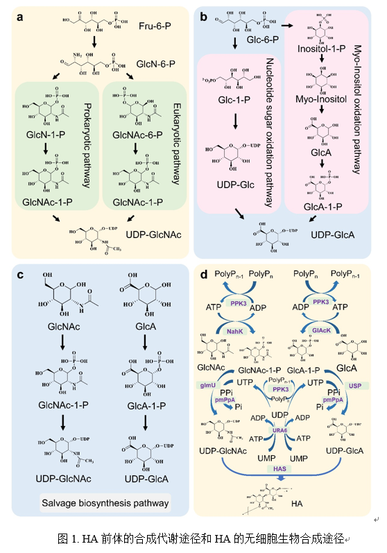 论文建立了一种无细胞级联催化系统,利用核苷酸补救途径,从廉价的单糖高效合成UDP-GlcA和UDP-GlcNAc,从而绕过了耗能的从头合成路线;并通过截短多杀巴斯德菌透明质酸合酶(PmHAS)的膜结合相关结构域,实现了其水溶性表达水平及顺序糖基转移酶活性。此外,还实施了ATP/UTP双再生策略以维持核苷酸供应。在优化条件下,该系统在24小时内可合成1.28 g/L的HA,其分子量范围为1.28×10⁴-1.02×10⁶ Da,底物转化率达到65.9%。这项工作不仅为规模化HA合成提供了一个经济平台,也为复杂生物聚合物建立了一个模块化的酶促工程化生产示范,在合成糖生物学领域展示了广泛的应用潜力。