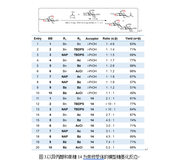 近日,伟德victor1946朱蕴韬教授课题组在中科院一区期刊Chinese Journal of Chemistry上发表了题为“Synthesis of Heparan Sulfate Backbone Oligosaccharides by Directly Installing cis-Linkages on Solid-Phase”的研究工作。本研究成功制备了一个包含九种硫酸乙酰肝素骨架寡糖的化合物库,其中GlcN、GlcA和IdoA之间的顺式糖苷键均在固相中构建(图2)。作者首先在液相中对十种具有不同C3-OH和C6-OH保护基组合的2-叠氮-2-脱氧硫代吡喃葡萄糖苷进行了糖基化条件探索。该研究发现,C6-OH位含有TBDPS保护基的硫代吡喃葡萄糖苷在构建GlcN与GlcA/ IdoA之间的α-1,4糖苷键时为最适供体。此外,根据团队先前的研究,在具有C2-OBn的葡萄糖硫苷进行糖基化时,3,6-位酯化可显著促进顺式选择性(J. Am. Chem. Soc.2021,143, 9758–9768)。本研究中砌块9和10 (图3)的结果进一步证实了这一结论。