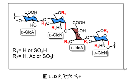 硫酸乙酰肝素(Heparan sulfate, HS)是糖胺聚糖(Glycosaminoglycan, GAG)家族中的重要成员,广泛存在于细胞表面及细胞外基质中。HS在高尔基体中经糖基转移酶催化合成,其结构由D-葡萄糖胺(GlcN)与D-葡萄糖醛酸(GlcA)[GlcN-α-1,4-GlcA-β-1,4-]或D-葡萄糖胺与L-艾杜糖醛酸(IdoA)[GlcN-α-1,4-IdoA-α-1,4-]组成的二糖重复单元构成。该骨架在糖醛酸的C2-OH位,以及葡萄糖胺的C6-OH、C3-OH和C2-NH₂位具有多个硫酸化位点(图1)。这种广泛的硫酸化修饰使HS带有高负电荷,赋予其独特的蛋白质-聚糖相互作用特性,并介导多种生物学功能,然而,该聚糖结构高度复杂且具有显著异质性,这为获取精确结构的该样品并用于后续生物活性的研究带来了巨大的挑战。目前,HS在液相中的化学合成已得到较好发展,并在构建HS化合物库方面取得了许多重要成果。尽管如此,该领域的深入发展仍需在糖化学专业知识的支撑下开展,并投入持续而系统的研究努力。