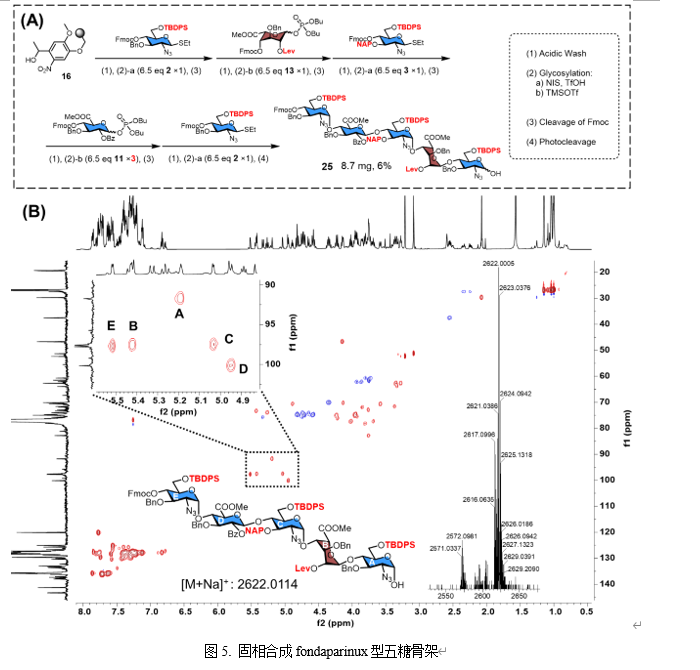 在固相构建HS寡糖骨架初期,作者测试了带有碱敏感连接子的Merrifield树脂(Chem. Eur. J.2025,31, e202500603),但由于碱切过程不仅会切断寡糖与树脂的连接并脱除Bz保护基,还会同时裂解TBDPS保护基并部分水解羧酸甲酯,导致其不适用于在潜在硫酸化位点引入正交保护基,因此该方案被放弃。作者最终选用含有光裂解连接子的固相载体进行后续研究,并在固相上成功合成了四个由GlcN-GlcA或GlcN-IdoA交替重复组成的二糖和四个四糖(图4)。最后,作者合成了一种包含GlcN、GlcA和IdoA结构单元的fondaparinux型五糖(图5)。所有潜在硫酸化位点均通过正交保护策略实现,获得了可接受的产率与优异的α-立体选择性,首次在固相上实现同时含有GlcN、GlcA和IdoA结构单元的完整HS骨架寡糖合成。该策略无需借助预制二糖砌块,而是在固相体系中原位构建了具有合成挑战性的顺式糖苷键,为复杂肝素寡糖化合物库的自动化构建提供了研究基础与有价值参考。