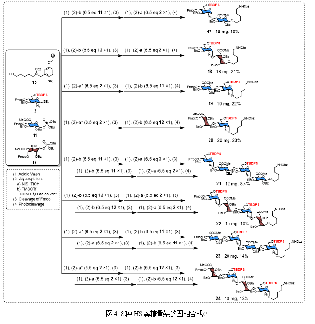固相聚糖合成(Solid-phase glycan synthesis, SPGS)是制备结构明确聚糖的一种高效技术,它能显著简化聚糖组装过程中间产物的纯化步骤。自2001年实现自动化聚糖组装(Automated Glycan Assembly, AGA)以来(Science2001,291, 1523-1527),过去二十年间已有多种具有不同生物学功能的聚糖通过该方法成功制备,包括具有反式糖苷键连接的糖胺聚糖,如硫酸软骨素、硫酸皮肤素和硫酸角质素。然而,在固相上构建含多个顺式糖苷键的聚糖仍是一项具有挑战性的工作,因为在链延伸过程中无法分离立体异构体。目前仅有少数关于固相组装含多个顺式糖苷键聚糖的报道。对于HS,由于葡萄糖胺和糖醛酸结构单元的反应活性较低,其固相合成面临更大挑战,需要同时解决反应活性与立体选择性问题。