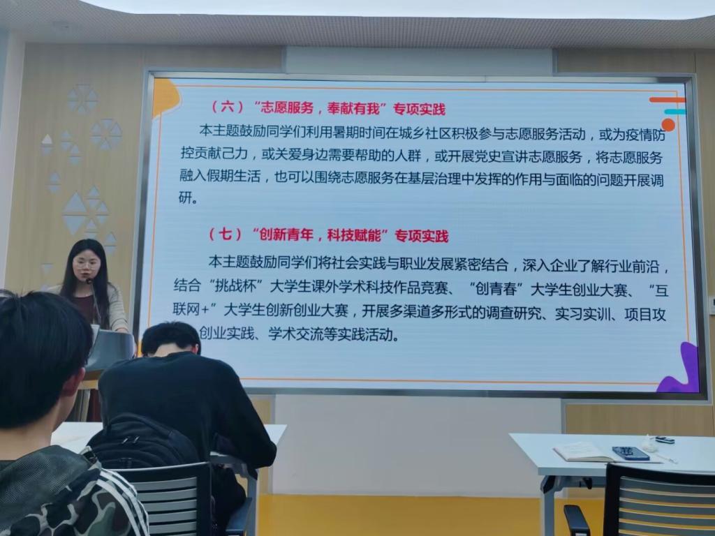 最后,王珏老师介绍了今年暑期社会实践策划大赛的相关情况,结合“学思想,见行动,强国有我新征程”主题,建议同学们从八个分主题入手,为自己的大学生活增添一段难忘的时光。