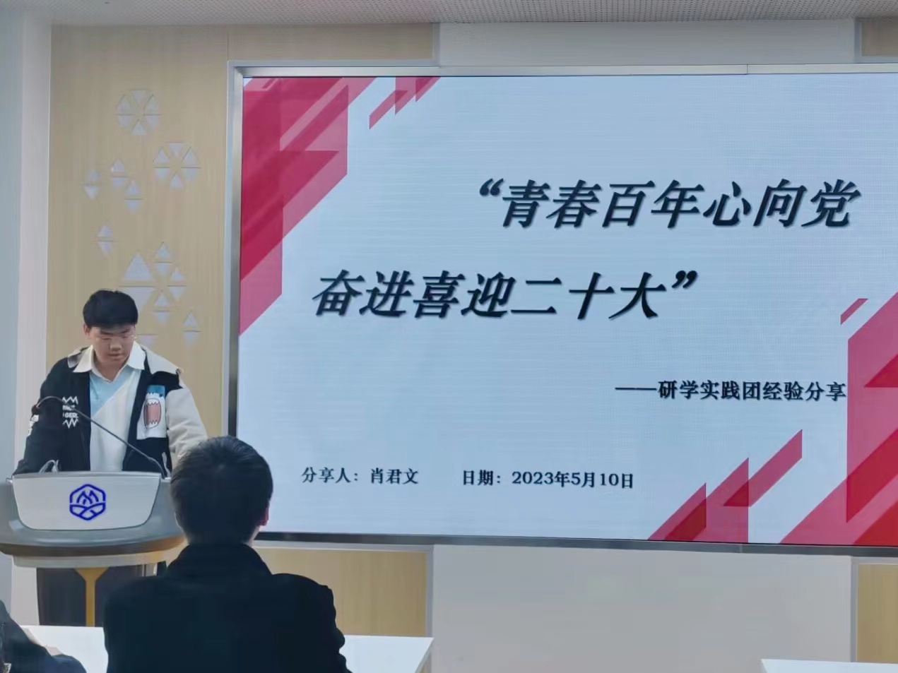 “青春百年心向党,奋进喜迎二十大”研学实践团团长肖君文讲述了他们用脚步丈量祖国大地和发挥青年责任与担当的实践故事。团队号召班级团支部成员结合家乡红色景点,围绕伟大建党精神等首批46个中国共产党人精神谱系,通过主题党课学习、红色教育基地参访等方式,切身感受中国共产党带领中国人民和中华民族取得的伟大成就,在学思践悟中汲取前进动力。团队自编自拍的视频《诵读百年芳华 青春献礼二十大》看的同学们热血沸腾。