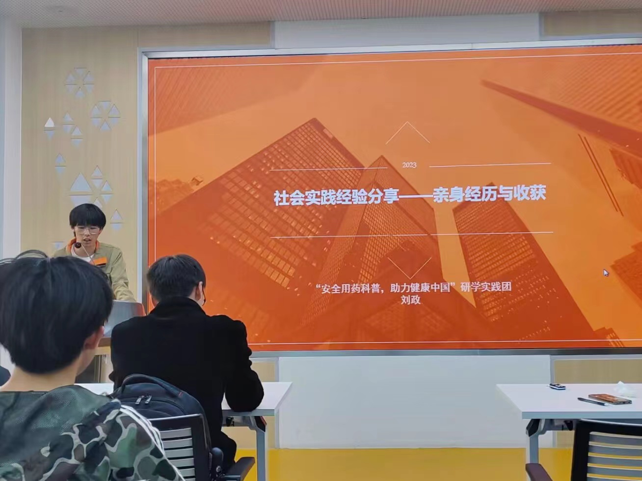 “安全用药科普,助力健康中国”研学实践团团长刘政分享了团队积极响应习近平总书记“没有全民健康,就没有全面小康”的号召,通过走访药企调研,多样化进行价值引领;开展问卷访谈,多渠道获取用药信息;走进青少年之家,打造药学启蒙小课堂;走进中老年群体,科普用药安全小知识等途径了解基层群众安全用药情况,传播安全合理用药知识,增强安全合理用药的科学理念。