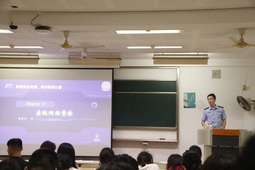 首先,王俊皓警官以什么是电信网络诈骗引入,结合往年江大学生被骗真实案例,讲解了反诈宣传活动的重要意义,并提醒同学们网络诈骗离我们并不遥远。