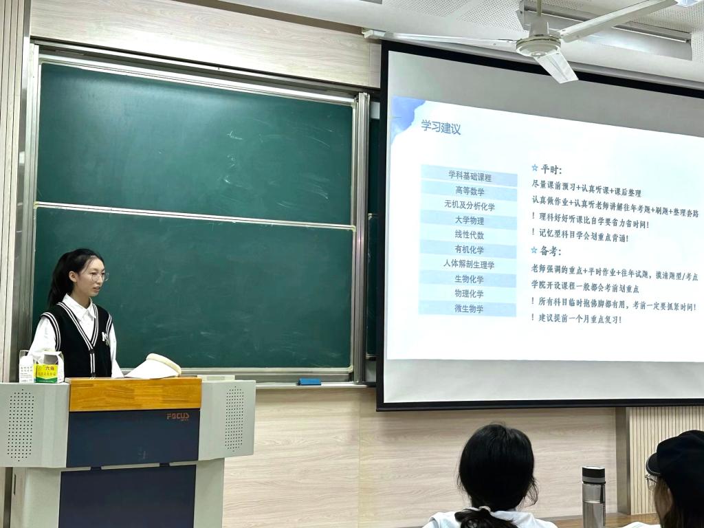 王锡楠从学习态度、学习方法、时间分配三个方面为同学们分享大一课程的学习经验,提供了自己的学习方法。他建议同学们先确立各个阶段的小目标,树立正确的学习观念,培养自主学习和自我评价的能力。“知识是活的,不要局限于一小部分”,他站在同学们的角度给予最中肯的方法,还向同学们推荐了百词斩背单词,生动幽默的讲解深深感染了同学们。