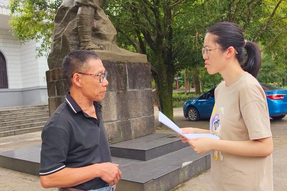 随后,实践团一行采访葛源革命烈士纪念馆馆长黄英明先生。黄英明馆长向实践团成员介绍:“来到这里的人看到邱金辉烈士的事迹,无不为之动容,对他肃然起敬。”“在短暂的一生中,他对共产主义事业的拳拳之心和为实现共产主义所表现出的铮铮铁骨,集中体现了中华民族百折不挠、宁死不屈的民族精神,是我们学习的楷模。”黄英明馆长寄语实践团成员们,中华民族是崇尚英雄、成就英雄、英雄辈出的民族,和平年代同样需要英雄情怀。希望有更多的中国青年继承并践行英雄精神,知党史、懂国情,知道自己想成为什么样的人,理解自己肩负的责任使命,在“正当年”的年纪为国家发展积极作贡献。