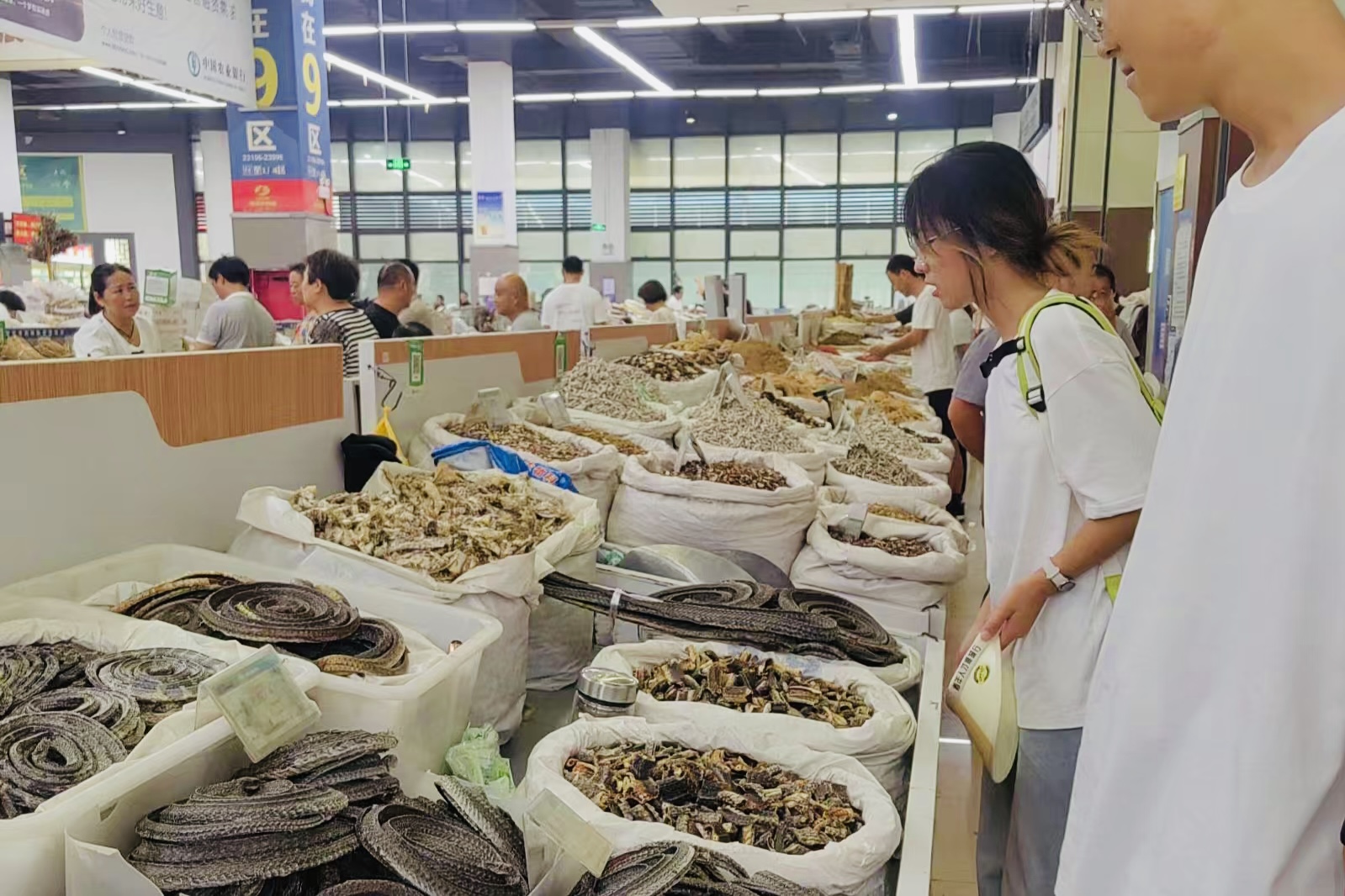 “华佗故里,药材之乡”。亳州素有“中华药都”之称,现已成为全球最大的中药材交易中心和全国最大的中药饮片、中药提取物、中药保健饮品生产基地。走进亳州康美中药城中药材交易中心,浓郁药香扑面而来,四海药材汇聚于此。穿行在熙熙攘攘的人群中,实践团参观了市场的一楼样品展示区、特色精品店铺以及二楼中药材集中贸易区,驻足于出售各式各样药材的摊位前,深入了解中药材的丰富品种和独特药性,掌握辨别中药材品质优劣的技巧。实践团了解到药材市场“‘两长’(“区长、组长制”网格化管理)共管一条心,诚信经营齐参与”的产业文化,感受到亳州中医药产业的国际竞争力和引领能力显著增强,世界中医药之都建设成效明显。