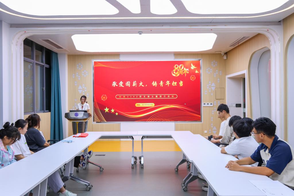 观看结束后,团支书王羽嘉从“赓续抗战精神”、“追忆抗战历史”、“重温英雄故事”、“争当时代传人”、“传承抗战精神”等方面带领大家进一步学习了抗战精神。她的讲解条理清晰、情感真挚,引导同学们思考如何将这份宝贵的精神财富融入当下的学习与生活中。