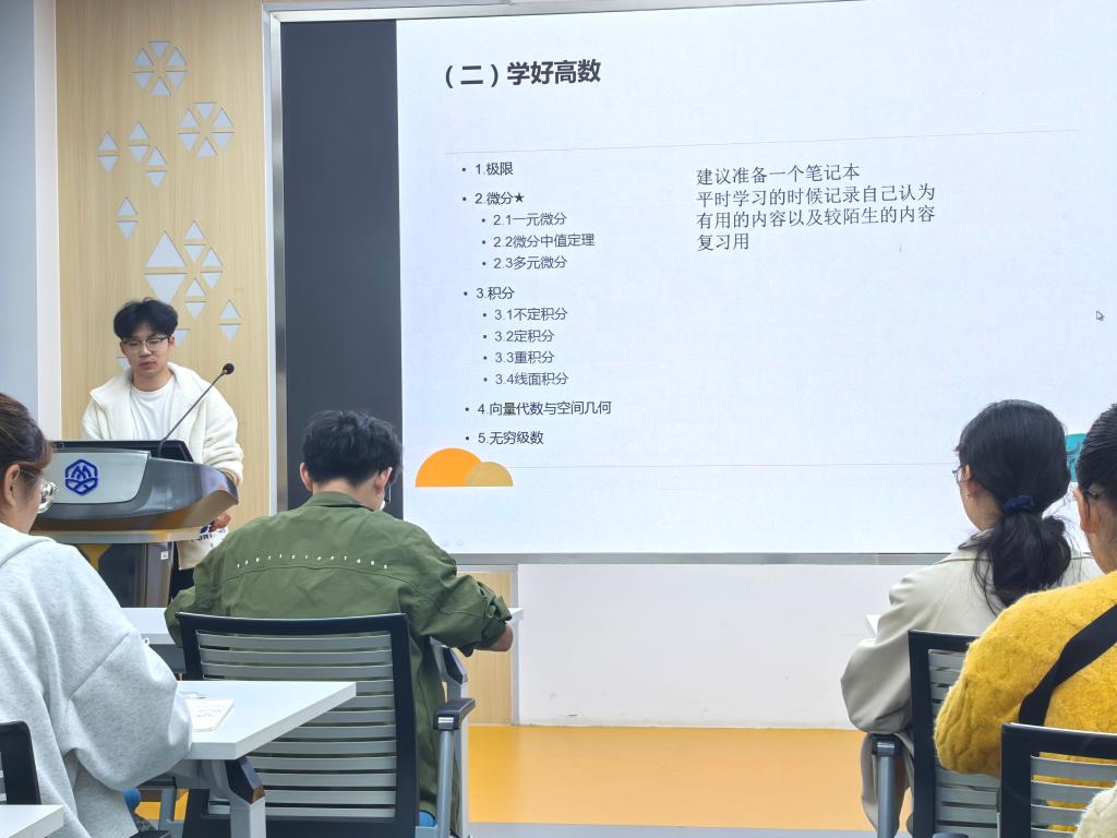 曾获江苏省高等数学竞赛本科一级B组二等奖的王冶从前期准备、中期沉淀、后期冲刺和考试应对四个角度切入,认真分析了高数中各个板块的重要性,以及基础夯实的关键性。另外分享了平时及时记录错题和关注课本例题的习惯,让同学们受益匪浅。在中期沉淀时,他强调了查漏补缺、总结归纳和做题三个方面的内容。结尾王冶同学指出夯实基础后方可有自信发挥灵感,大胆猜测,小心论证。他的发言简洁有力,现场观众听得聚精会神,相信同学们也产生了共鸣,更加明确了高数学习的方向。