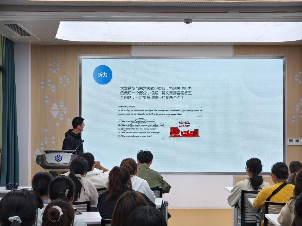 曾获全国大学生英语竞赛二等奖的赵乐岩从竞赛背景、具体题型分布、以及备考技巧三个方面展开,毫无保留地分享了他对大英赛每种题型的独到见解和应对策略,同时指出竞赛时间的紧迫性并提出了“快、快、快”的做题策略。在竞赛备考角度,他也结合个人经历,介绍了可同时准备四六级以及大英赛的方法,合理安排真题训练,找到适合自己的节奏。最后他推荐了相关备考资料来帮助学生提升英语素养,将英语融入日常生活。赵乐岩的分享生动有趣,为同学们的英语学习之路点亮了明灯。