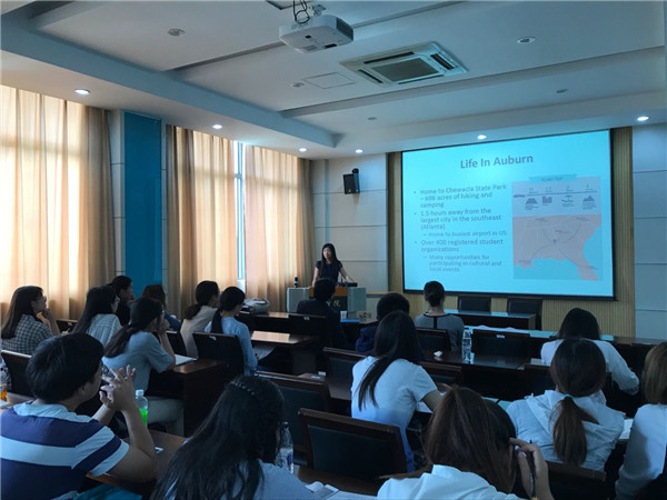 奥本大学药学院代表钟敏表示非常荣幸与我院建立友好合作关系。她提到,奥本大学药学院与我院有着很深的渊源,学校在校园美景建设等方面同样十分突出,拥有着美国传统大学城的风光。随后,她介绍了奥本大学药学院科系组成、师资队伍、研究方向、实验室环境等基本情况,详尽解析了奥本大学药学院西式教学、就业前景广阔的诸多优势。紧接着,现场同学就奥本大学学校住宿、教育方式等进行提问,奥本大学药学院代表一一进行了详细解答。