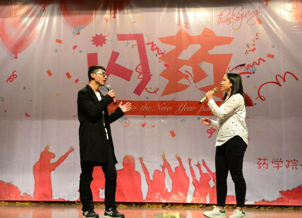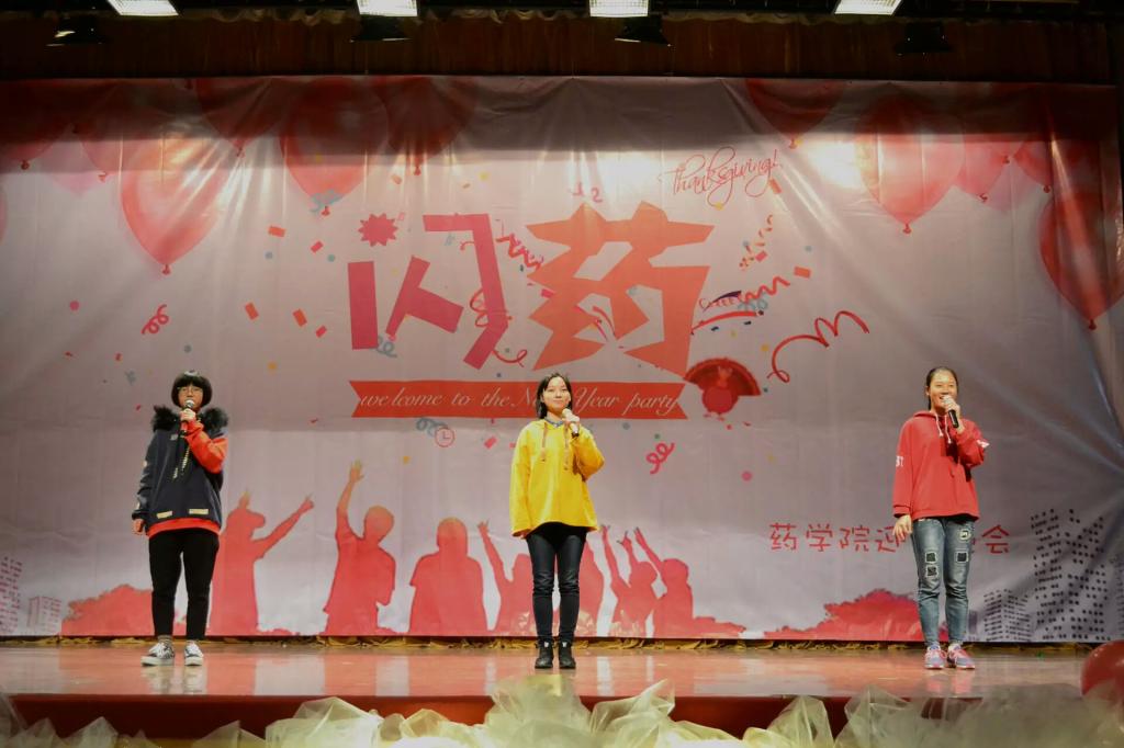 为全面展示我院学生风采,推进学校艺术教育工作,丰富学生校园生活,伟德victor1946药学院于2017年11月30日晚在南区活动中心举行主题为“闪药”的迎新年晚会。出席晚会的嘉宾有药学院党委副书记白冰老师、分团委书记杨薇薇老师、人事秘书顾峻老师、办公室主任徐贻学老师,同时学院所有大一新生及高年级同学参加本次晚会。晚会由1603的李金、1701的李菲、1702的孙振航和1703的张嘉文担任主持。