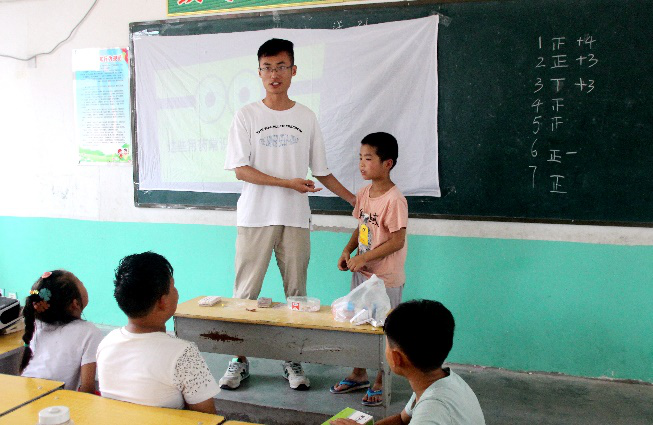 “七彩梦想:蒲公英灿烂随行”。7月6日上午,在范楼小学举办了开班仪式,本次支教活动正式开始。本次支教活动依托学院兰考对口支教项目,在河南省兰考县范楼小学开展了为期10天的支教,特面向暑期留守儿童,接收了一到五年级100名学生,分为两个教学班。本次支教课程中不仅开设了常规的语文、数学、英语、体育等课程,同时结合我院制药工程专业的特色,开设了趣味实验、手工、用药安全等特色课程,既激发了支教团同学们的教学热情,丰富了教学形式,又为范楼小学注入了新鲜的血液。