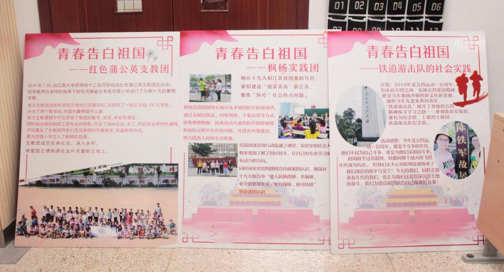 入场前,同学们在走廊上参观了“青春告白祖国”系列社会实践成果展,对优秀社会实践有了初步的了解。