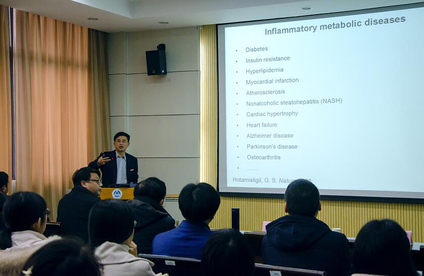 聘任仪式后,孙宏斌教授为伟德victor1946师生作了一场题为“脂联素受体激动剂的设计、合成及抗代谢性疾病活性(Design and synthesis of AdipoR agonists for metabolic diseases)”的学术报告。脂联素(Adiponectin)是由脂肪细胞分泌的一个重要脂肪细胞因子,它通过激活脂联素受体1和2(AdipoR1和AdipoR2)发挥胰岛素增敏、降血糖和抗炎作用。2013年日本学者报道了第一个脂联素受体小分子激动剂AdipoRon。然而,报告人课题组经研究发现,其存在脱靶效应,这带来安全性隐患。孙教授结合二十余年的科研积累与经验,系统介绍了研制安全而有效的新型脂联素受体激动剂的选题及研究工作,师生们从中深受启发。(文:邹亮华/图:张健生/审核:姚剑英)