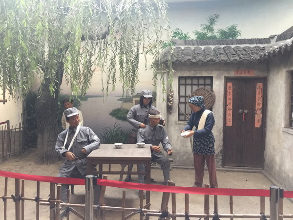 然后,支部成员参观了沙家浜革命基地中的横泾老街。横泾老街影视基地保存了农村建筑旧貌,吸纳江南小镇精华,重现了上世纪三十、四十年代的江南乡间风貌和文化特征。京剧《沙家浜》每天准时上演,让游人缅怀阿庆嫂、郭建光的英雄事迹。大家重点参观了老街中的刁家大院,电视连续剧《沙家浜》就是在这里完成的。革命时期,作为地下联络站的“东来茶馆”在京剧《沙家浜》中被艺术处理成了“春来茶馆”,所以现在沙家浜革命基地里的茶馆都取名为“春来茶馆”。