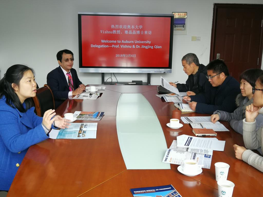 2018年3月6日-7日,奥本大学Harrison药学院Vishnu教授、骞晶晶博士等一行访问药学院,就推进“伟德victor1946药学院与奥本大学药学院3.5+1.5本硕连读项目”等合作事宜进行了深入研讨。药学院党委书记姚剑英、副书记白冰、院长助理周娟等参与了讨论。