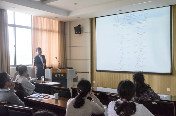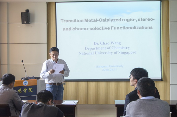 4月11日下午,药学院在306举行了学术报告会,邀请了来自新加坡国立大学的王超博士后作“过渡金属催化的区域、立体、化学选择性的官能团化”的学术报告,会议由药学院药学系主任王文龙主持,院长助理巩凯、校聘研究员张燕等老师和感兴趣的研究生、本科生共同聆听了报告。