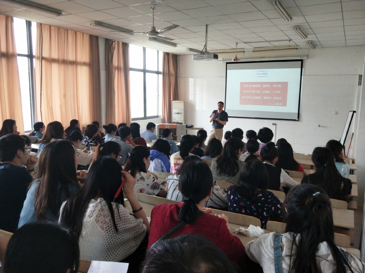 接下来陈教授从当下中国的道德镜像、道德层次的深层诱因、道德层次的理性分析以及中国人的道德智慧四个方面展开主题讨论。当下中国的道德镜像一个突出问题就是智能手机的应用和普及,手机确实方便了大家的生活,但同时是把双刃剑,不仅影响人与人面对面的交流,而且手机中碎片化的信息会使我们不易形成自己的独立思考和判断,从而影响大家的未来和发展。关于道德层次的深层诱因,教授从以下几点展开:理想与现实的矛盾、传统与现代的断层、家庭与社会的脱节、自我与他者的对立、创造与风险的比增、虚拟与现实的互逆。在理性分析方面,陈教授用人性中的真善美、人类社会的真善美并没有减损或泯灭,只是被释放出来的经济冲击力和权力冲击力暂时的遮蔽一句话做了巧妙的解答。最后,教授深层次讲解了《大学》之道,从《爱莲说》的人生智慧也进一步讲述了中国人的道德智慧,教导大家要学会积极地走进社会,适应社会,告诫在座师生成功后不要骄傲自满,要学会用合理的方式来推销自己,对于不好的习惯和事情更要学会远离。
