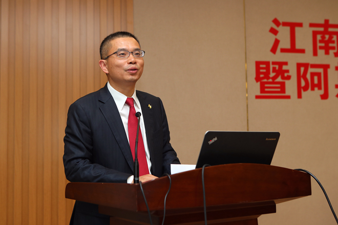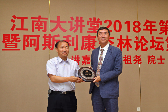 顾正彪副校长为沈祖尧院士颁发“江南大讲堂”讲座教授纪念牌