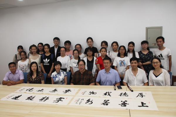 随后的座谈交流会在图书馆BYT509研讨室举行,旨在进一步探寻诗词文化和书法艺术。在交流中,任先生先为大家介绍了词牌名的格式、起源以及含义。针对同学的提问,任先生就行书的流畅、草书的韵味、楷书的联气等话题与学生们进行深入探讨,使同学们略窥书法文化的一二精粹,明白字中“气”的意蕴。任先生还进行了现场教学,书写了“学无止境”、“厚德载物”、“宁静致远”和“上善若水”四幅墨宝并赠予学生,以资鼓励。