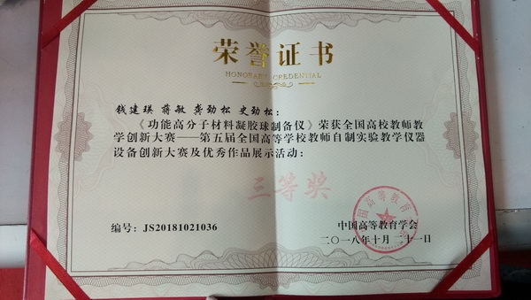 2018年10月18-21日,由中国高等教育学会主办的第五届全国高等学校教师自制实验教学仪器设备创新大赛及优秀作品展示活动在成都举行,我院实验教学中心钱建瑛等老师自制的《功能高分子材料凝胶球制备仪》经层层评选脱颖而出,最终获得三等奖。