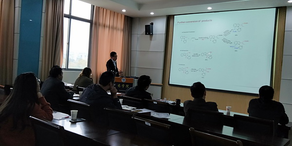 王成明博士师从德国亚琛工业大学世界著名有机化学家Magnus Rueping教授,现在美国杜克大学做博后研究。王成明以“过渡金属催化导向碳氢键官能团化”为题,介绍了在过去几十年中过渡金属催化的碳氢键活化研究取得的巨大进展和在快速实现分子结构多样性组装领域的广泛应用,并分享了他在这一领域所做研究。
