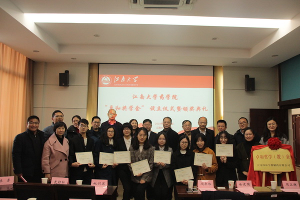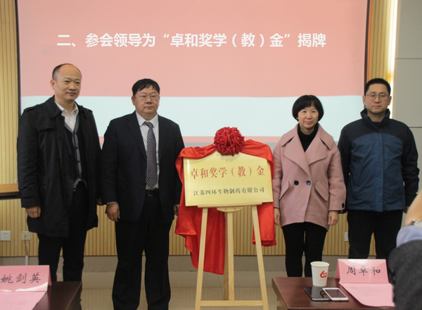 12月28日下午15:30,伟德victor1946“卓和奖学(教)金”设立仪式暨首届颁奖典礼在药学院306会议室举行。卓和药业集团董事长、总经理周卓和,卓和药业集团常务副总经理徐建国,南京市潮汕商会创会会长周卫群,无锡市潮汕商会会长周武振,无锡市潮汕商会执行会长潘秋桂等嘉宾亲临现场,药学院党委书记姚剑英,药学院副院长史劲松,化工学院党委副书记、副院长田卫平,生工学院党委副书记、副院长陈勇以及全体获奖师生出席颁奖典礼。典礼由药学院党委副书记、副院长白冰主持。