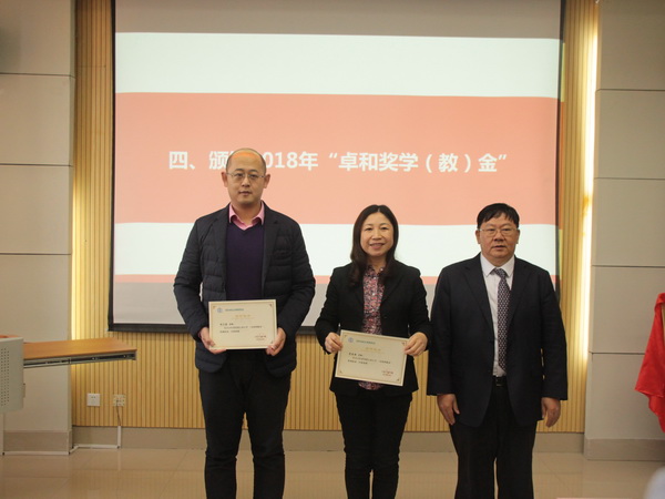 捐赠企业领导周卓和董事长、徐建国副总经理与药学院党委书记姚剑英、副院长史劲松共同为“卓和奖学(教)金”揭牌。接着,徐建国副总经理宣读了2018年度“卓和奖学(教)金”的奖励名单,8位同学与2位教师先后上台领奖并与颁奖嘉宾合照留影。药学院制药工程1503班本科生刘璐代表获奖学生发言,她对卓和药业集团的捐赠助学表示由衷的感谢,表示荣誉只属于过去,希望寄托于未来,愿在追求卓越的路途上,砥砺前行,不断突破。教师获奖代表张晓梅副教授在发言中说,非常荣幸能够获得卓和奖教金,这是对自己工作的肯定和鼓励,真诚感谢卓和药业集团的支持与激励以及学院领导、同事的关心与帮助。