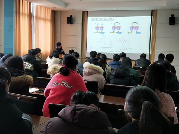 钱明成博士师从比利时根特大学药学院Serge Van Calenbergh教授,主要研究潜在的新靶点GPCRs的二聚体。本次报告以“合成及药理评价新型的GPCRs二价配体”为题,设计合成GPCRs的二价配体小分子来研究GPCRs的二聚化以寻找新的药物靶点。