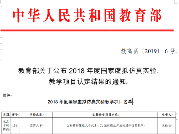 日前,教育部公布了2018年度国家虚拟仿真实验教学项目的评审结果(教高函[2019]6号),我院史劲松教授主持的“生物药物重组人干扰素α2b注射剂生产线的虚拟仿真教学”成功获批,成为全校第一个国家级虚拟仿真实验教学项目,实现了我校在该教学项目上零的突破。