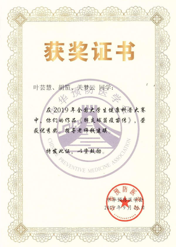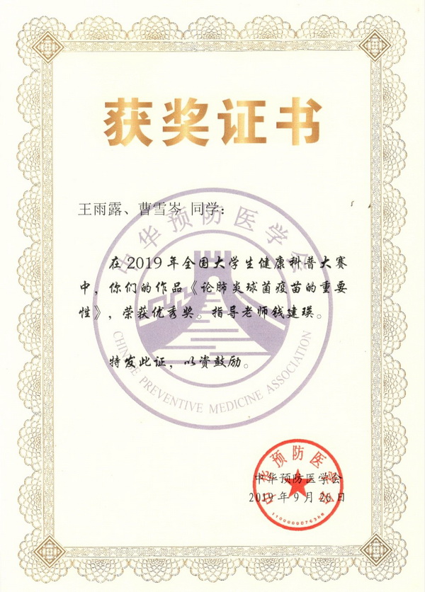 我院此次共组织了两支队伍参赛,一支由2017级制药工程专业王雨露、曹雪岑两位同学组成,另一支由2017级制药工程专业叶芸慧、关梦云、胡笳三位同学组成,由钱建瑛任指导老师。两支队伍在制作科普作品的过程中均融入了自己的对于肺炎球菌疫苗的理解与看法,希望能够通过自己的作品将有关肺炎球菌疫苗的知识普及大众。在夏令营调研方案方面也是对实践地点进行了深入的了解,制定了针对性的调研方案。最终,两支队伍的作品《肺炎球菌疫苗传》和《论肺炎球菌疫苗的重要性》均获得了优秀奖。在钱老师的悉心指导下,两支队伍的作品紧扣主题,将肺炎球菌疫苗的有关知识向大众进行了充分展现,伟德victor1946药学院因此荣获“优秀组织单位”奖。