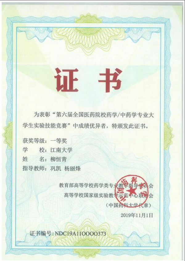 2019年11月1-2日,由教育部高等学校药学类专业教学指导委员会、高等学校国家级实验教学示范中心联席会以及中国药科大学主办,河南中医药大学承办的“全国医药院校药学/中药学专业大学生实验技能竞赛”在郑州隆重举行。来自全国122所高校714名师生代表参会。我校药学院2016级本科生柳恒青、刘爽两位同学凭借其扎实的专业基础和熟练的实验技能,分别在比赛中斩获一等奖和三等奖。
